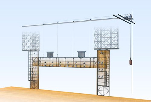 1.設置于舞臺臺口內側的假臺口,由上片和兩側片組成。通過上片和側片位置 的變化,可以調整舞臺開口的大小,即可以將開口縮減。2.假臺口上片和兩側片鋼結構形式要便于安裝舞臺燈具。同時為固定設置追光 燈提供便利,可上人操作使用燈具。3.假臺口上片由電動提升或下降,側片為手動平移并設有導向裝置。 4.假臺口上片、側片分別由帶導軌的鋼制框架,驅動系統和控制系統構成。設有備用系統,可以手動操作復位。 具體由下述部分組成: ·上片為兩層鋼制框架,兩端設有常閉式防護門,并通過"碼頭"與天橋相連。 側片為多層鋼制框架。操作面應敷設絕緣防滑橡膠板和踢腳板。 ·上片的卷揚系統由電動機、減速器、兩個獨立的制動器、卷筒等組成。側 片驅動機構由行走輪、導向系統等組成。 ·導軌 ·滑輪組件 ·上片用平衡重時、應設平衡重架、導軌和防護網 ·鋼絲繩和配件 ·有提升、下降和緊急停車按鈕的操作盤可以實現就地操作。應與其它相關 設備和安全防護門動作聯鎖。 5.為燈光、音響電纜進入假臺口提供良好的條件和必要的裝置。渡橋的兩側應 便于安裝燈具,設垂直電纜收納裝置和水平電纜布線裝置。